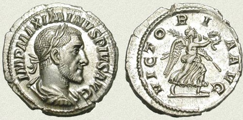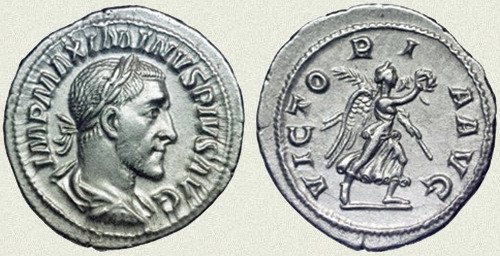 Fijémonos bien en el retrato, en cada una de las letras de su leyenda y en su posición relativa al busto del emperador, y veremos que los anversos son claramente coincidentes, y que no ocurre lo mismo con los reversos. Nuevos anversos coincidentes; esta vez en dos buenos denarios de Maximino: