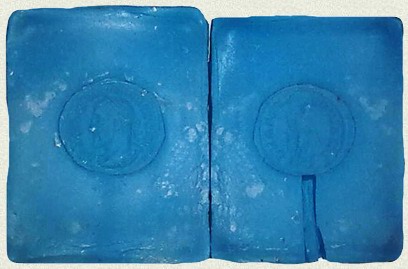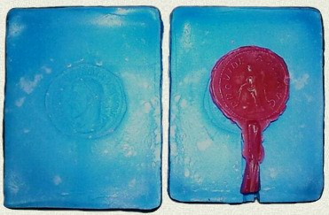 Una vez la silicona haya fraguado, y dada su altísima calidad, habrá sido capaz de copiar hasta el más mínimo detalle de la superficie de las monedas, aunque por supuesto, en negativo (las partes elevadas de la moneda serán ahora hondas, y las partes hondas, elevadas). Ahora, el falsificador deberá cortar con cuidado el molde de silicona hasta conseguir liberar la moneda original, y obtendrá el molde listo para ser usado, tal y como nos muestran las siguientes imágenes.