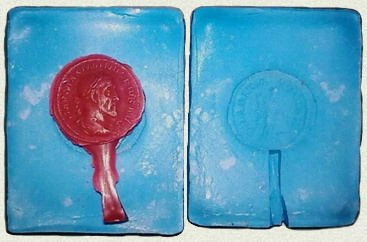 Tras la inyección de la cera, y una vez enfriada esta, se consigue una copia perfecta de la moneda original en cera, y dado que este material se ha solidificado también a lo largo del canal o bebedero, el aspecto de las copias obtenidas será el que mostramos en las imágenes inferiores:
