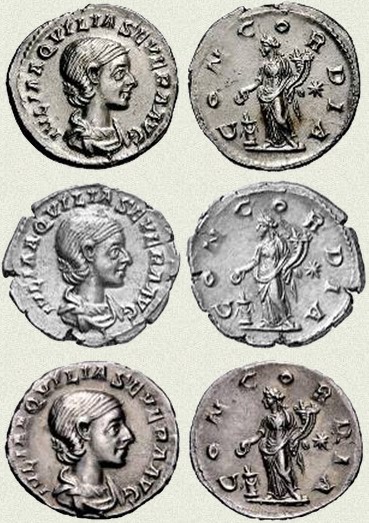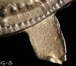 Ahora bien, ¿significa este hallazgo que nuestro denario también es un clon? Para responder correctamente a esa pregunta, que nos hemos de hacer siempre que nos encontremos en un caso como este, deberemos fijarnos en primer lugar en la forma del flan. Si bien los dos clones de la fotografía superior son idénticos entre sí, (fijémonos en la muesca del anverso arriba a las 12, o las dos muescas del reverso a la 1 y a las 6), no ocurre lo mismo con la imagen del denario auténtico, en el que no aparece ninguna de esas señales. Pero, ¿podría tratarse de diferencias únicamente debidas a ciertos retoques en la figura de cera durante el proceso de obtención de los clones? Para contestar esa cuestión fijémonos en el desplazamiento del cuño respecto al flan (el centrado de la moneda); en la auténtica, la acuñación está desplazada hacia la izquierda, dejando un par de milímetros entre la grafila y el final del flan entre las 12 y las 6. En las monedas clonadas, el descentramiento de los anversos es hacia abajo, entre las 9 y las 3. La conclusión es que nuestra moneda no tiene nada que ver con los clones, es auténtica y ha sido otra moneda que comparte cuño con ella la que ha sido clonada. Sin embargo, en el caso de coincidencia total, deberemos pensar que nuestra moneda es un clon, buscar signos de fundición y una vez hallados estos, condenar la moneda que estamos estudiando como falsa. De hallar signos claros de acuñación, podría tratarse también del original del que partieron el resto de los clones, pero la posibilidad de que esto ocurra es, aunque real, algo escasa. Otra posibilidad, cuando encontremos monedas del mismo cuño que la nuestra, es que se trate de monedas procedentes de un cuño falso. En este caso, y dado que el falsario no está obteniendo copias idénticas por fundición, sino que está fabricando monedas acuñadas con un cuño que él mismo ha fabricado, cada una de las monedas será distinta y no valdrá de nada lo dicho para las copias fundidas.