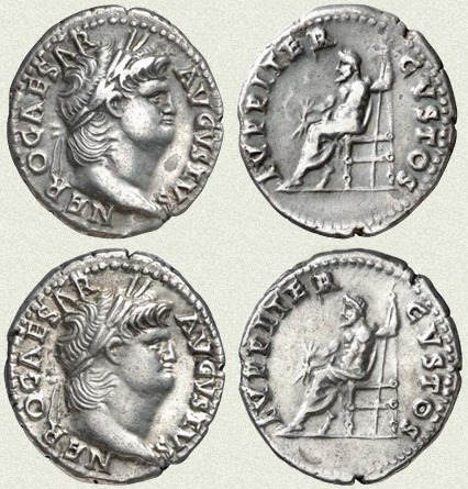 Esas monedas gemelas, una vez distribuidas por el circuito numismático, son las que deberemos intentar localizar en nuestra búsqueda de posibles copias fundidas, siempre teniendo en cuenta que, para tratarse de auténticos clones, deben ser extremadamente similares. Fijémonos bien; ahora no estamos ante una moneda de igual cuño, sino ante una moneda "demasiado" parecida a la nuestra. Para entender mejor este punto tan importante imaginémonos que estamos autentificando uno de nuestros denarios, en este caso un denario de Nerón.
