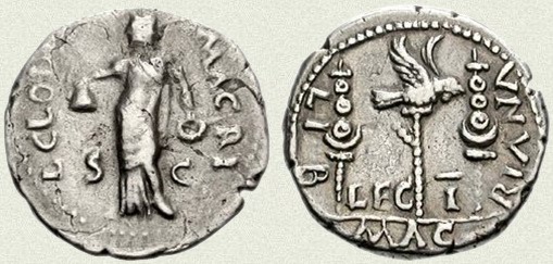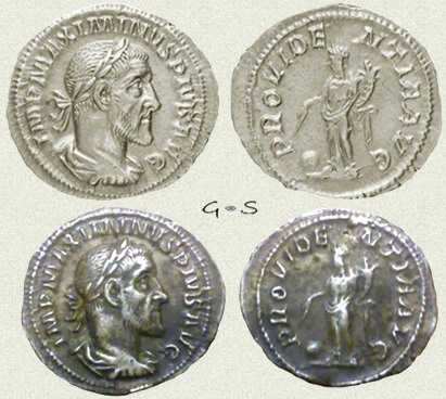 Imagen 7.3. Denario de Clodio Macer con diferente desgaste en anverso que en reverso. Pero aun sabiendo que estas circunstancias pueden darse y que la falta de coherencia en los desgastes no suele ser concluyente para condenar una moneda, sí que es bueno que tengamos presente que lo más frecuente es que tanto el anverso como el reverso presenten niveles similares de desgaste. Un hecho a tener en cuenta y ante el que debemos estar sobre aviso, es que las copias obtenidas mediante micro- fusión, a consecuencia del método de fabricación, suelen presentar una de las dos caras de mayor calidad que la otra, con mayor probabilidad de presentar burbujas y con una menor reproducción de los relieves, por lo tanto, una cara con distinto aspecto que la otra nos debe poner en alerta ante esta posibilidad. Las siguientes fotografías muestran, en primer lugar, un denario auténtico de Maximino y justo debajo, su clon obtenido por micro-fusión. Tal y como podemos observar, el clon ha reproducido muy dignamente el anverso de la moneda auténtica, pero el nivel de detalles del reverso ha resultado mucho peor, y aparentando un mayor desgaste. Este es el tipo de situaciones en las que nos hemos de mantener más alerta.