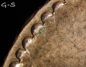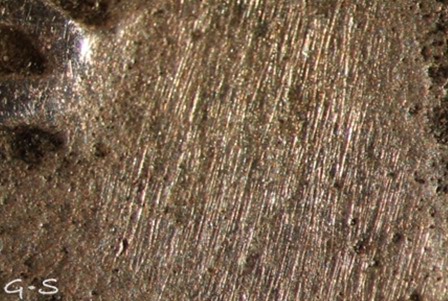 En este otro ejemplo es el campo el que presenta demasiadas rayas en una sola dirección, sin duda hechas para ocultar alguna prueba de fundición en la moneda y que no están justificadas ni por el desgaste general de la moneda ni por una limpieza demasiado agresiva, que debería afectar también a otras partes de la pieza.