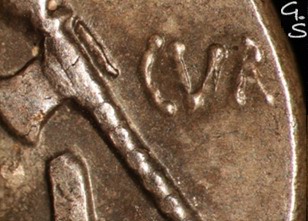 Imagen 7.5. Reverso de un denario falso de Gens Sulpicia (Colección Siredv). Sin embargo, tampoco este hecho es concluyente por sí solo ya que en ocasiones los cuños resultaban empastados en alguno de sus puntos (rellenos de material o suciedad) o se desgastaban en una zona más que en otra, produciendo un efecto similar en las monedas auténticas. Otro ejemplo, en este caso de un denario de Julio Cesar falso por acuñación, donde el aspecto de la grafila aparece ahora con un excesivo desgaste en comparación a los dos círculos de la leyenda que conservan una perfecta esfericidad sin ningún desgaste aparente: