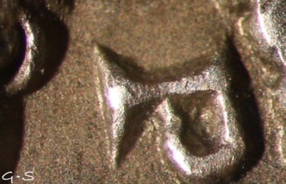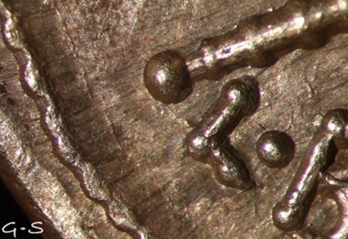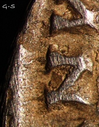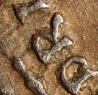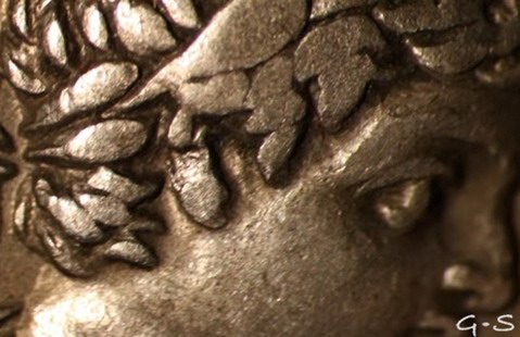 Imagen 7.8. Detalle de una letra y parte del campo en un denario falso de Caracalla obtenido por micro-fusión. Colección GS. Mientras la letra "P" presenta un cierto desgaste, el campo permanece completamente inmaculado, sin rastro de circulación alguna. De igual modo y tal y como podremos ver en el detalle del busto, aunque se aprecia un desgaste considerable en el pelo y en corona de laurel del emperador, se trata de una erosión demasiado uniforme, sin las rayas o golpecitos que de lógica debería presentar. La silicona o la cera de los moldes, no han sido capaces de reproducir esas pequeñas rozaduras, y por lo tanto han desaparecido de la copia dándole ese aspecto sospechosamente liso.