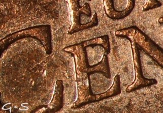 Imagen 7.7. Detalles de una moneda de dos céntimos de euro con circulación normal. Tal y como podemos ver, las rayas, golpes y rozaduras son aleatorios, no siguen un patrón común y son menos frecuentes alrededor de los relieves de las letras (en la imagen de la izquierda) y dentro de la estrella incusa, en la imagen derecha, tal y como cabe esperar en una moneda que realmente ha circulado. Fijémonos siempre en este tipo de detalles cuando sometamos a nuestras monedas al examen microscópico. De modo análogo, la ausencia total de golpes, rayitas y rozaduras en una moneda con un cierto desgaste nos ha de alertar especialmente, por la sencilla razón de que es imposible que una moneda que está desgastada por haber circulado durante mucho tiempo no los presente. Veámoslo en este denario falso fundido de Caracalla de altísima calidad: