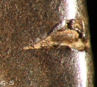 Imagen 9.16. Grieta mal reproducida en una copia de muy alta calidad de un denario de Trajano. Colección GS. Veamos ahora diversos ejemplos de grietas mal simuladas, que apenas han podido ser reproducidas. En el examen al microscopio binocular de nuestras monedas, es necesario que busquemos este tipo de señales a conciencia a lo largo y ancho de todo el canto ya que con facilidad nos pueden pasar desapercibidas y son un signo clarísimo de fundición.