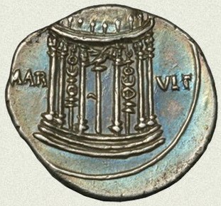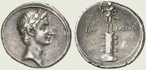 Imagen 13.1. Denario auténtico de Octavio con pátina oscura de colección antigua. Colección GS.