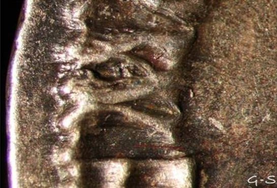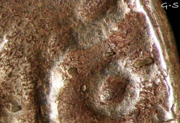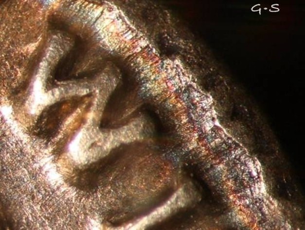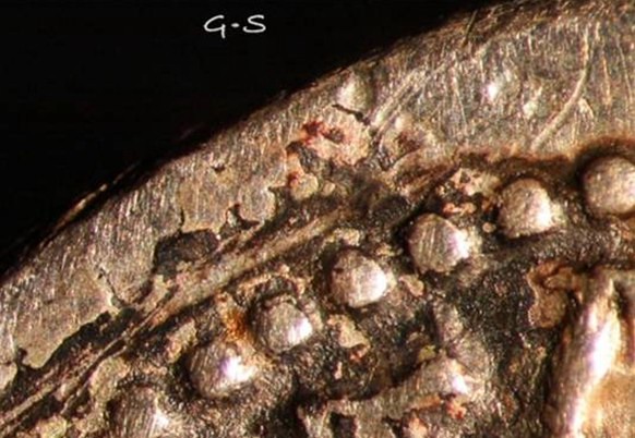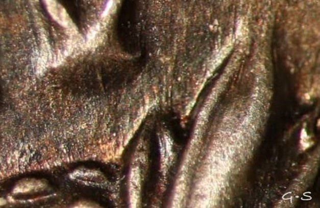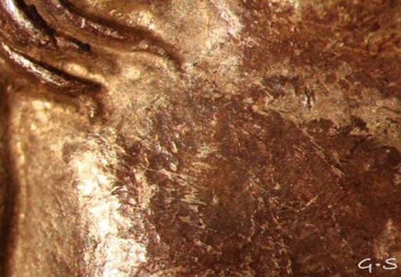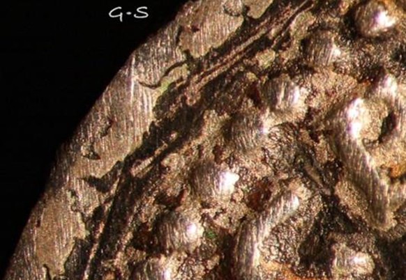 Imagen 13.4. Aspecto de un denario auténtico con pátina oscura bajo el microscopio. Colección GS. Otro tipo de pátina que adquieren determinados denarios es la irisada; suele predominar un bello color azulado y en algunas zonas se aprecian esos tonos de varios colores que recuerdan al arco iris.