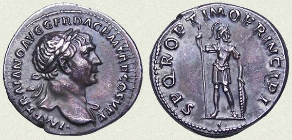 Imagen 13.5. Denario auténtico de Trajano con una bellísima pátina azulada.