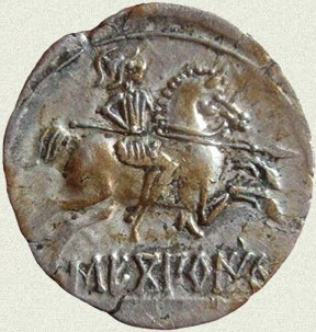 Imagen 13.9. Denario auténtico de Sekobirikes con una curiosa pátina marrón sobre el caballo.