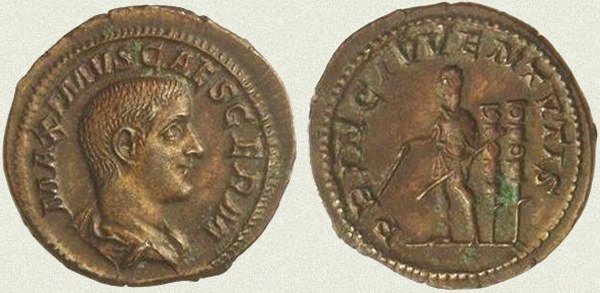 Imagen 13.10. Denario auténtico de Máximo con una bella y singular pátina marrón. Llegados a este punto es conveniente hacer hincapié en que normalmente las monedas falsas no presentan ningún tipo de pátina. Los falsificadores, sabedores de que es mucho más creíble una moneda con un bonito tono, intentarán en muchas ocasiones imitar esas pátinas mediante diversos procedimientos, entre ellos la inmersión en agentes químicos tales como la lejía. Veamos a continuación varios ejemplos de pátinas falsas: