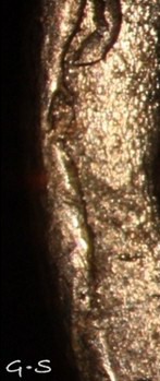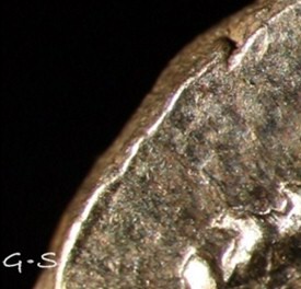 Imagen 16.6. A la izquierda, silicua fundida. Colección Numisma. EXCESOS DE MATERIAL Y REBABAS Otro factor, asociado al estudio del borde de los denarios, es la búsqueda de la presencia de ciertas rebabas o excesos de material que se forman junto al borde en determinadas copias obtenidas por micro-fusión. Estas rebabas, formadas al enfriarse la plata líquida sobre el molde cerámico, no tienen sentido en un denario auténtico acuñado y por lo tanto su localización bastará, por sí sola, para condenar la moneda que estamos observando. Veámoslo en los siguientes ejemplos: