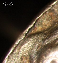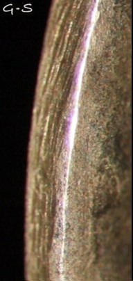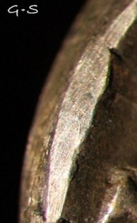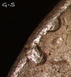 BORDES DEMASIADO AFILADOS Hay que establecer una diferenciación entre los bordes de las monedas falsas obtenidas por acuñación, y los bordes de las monedas falsas obtenidas mediante fundición, ya que el aspecto de ambas suele ser muy distinto y presenta sus propias características. En primer lugar, los denarios falsos obtenidos por acuñación suelen presentar un borde típicamente afilado que forma con el canto un ángulo casi recto, tal y como podemos apreciar en los siguientes ejemplos: