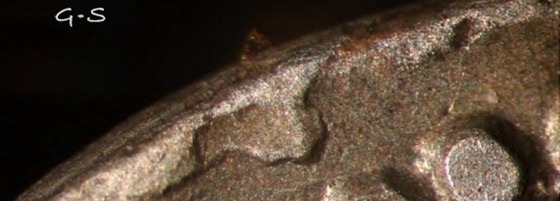 Imagen 16.4. Denario falso acuñado de Marco Antonio. Colección GS. No hay duda, la observación atenta con la lupa o el microscopio de cualquiera de estos seis denarios bastaría por sí sola para condenar a cualquiera de ellos, ya que jamás una moneda auténtica presentará ese aspecto a lo largo de toda la longitud de su canto. De modo análogo, el borde de algunos denarios obtenidos por micro- fusión presenta también un aspecto demasiado regular. Ciertamente nunca será tan afilado como el de los denarios acuñados, pero aun así suele mostrarse demasiado redondeado, demasiado "perfecto". Es cierto que el borde de algunos denarios auténticos puede presentar ese aspecto en algún punto de su perímetro, pero creo que sería prudente que si el denario que estamos examinando se asemeja a las siguientes imágenes, aumentemos nuestra vigilancia ya que muy posiblemente nos encontremos ante una copia por algún tipo de fundición.