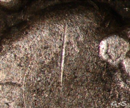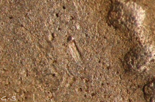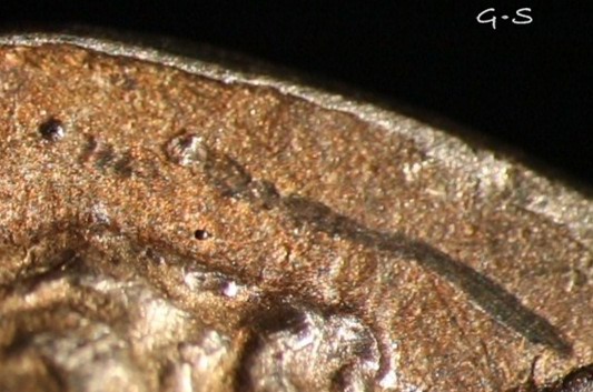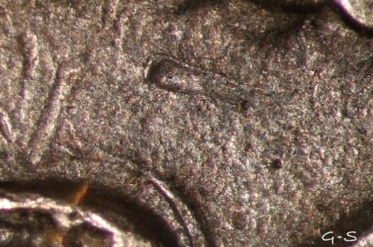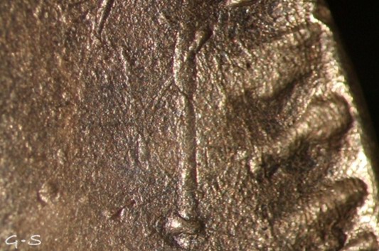Vamos a hablar en este último capítulo de un signo menor, con muy poca importancia y casi anecdótico, pero aun así no hemos querido dejarlo olvidado ya que hemos tenido ocasión de hallarlo en varias ocasiones mientras estudiábamos las monedas falsas empleadas para esta guía. Se trata de algo que hemos bautizado como "dedo en la mantequilla", puesto que esa es la imagen que nos viene a la cabeza al verlo al microscopio o a través de la lupa.