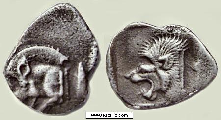 Reverso: cabeza de león rugiendo, dentro de un cuadrado incuso.