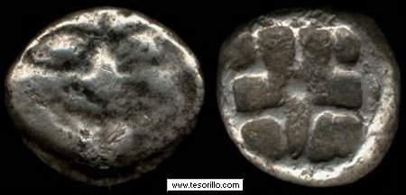 Moneda de 12-13 mm y 3,0 g acuñada alrededor del año 480 a.C. en