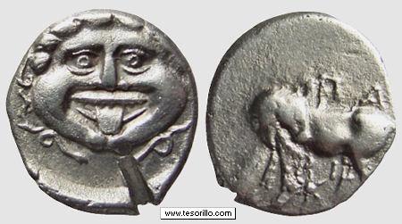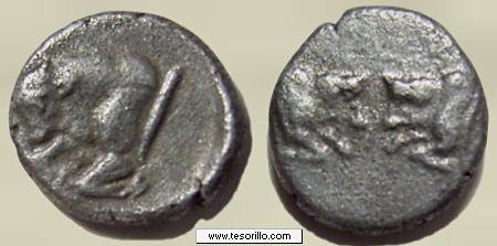 Moneda de 10-13 mm y 0,8 g acuñada entre los años 480-450 a.C. en