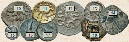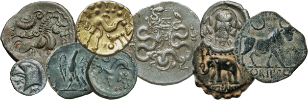 Veamos también la siguiente imagen, en ella tenemos otros nueve ejemplos de monedas con representaciones de animales. Dos de estas monedas se acuñaron a mediados del siglo I a.C. en las Galias. ¿Sabrías identificar correctamente estas dos monedas? (Pista: su peculiar estilo las delata).