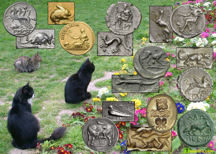 Sobre una fotografía de los jardines del Palacio Topkapi de Estambul (Turquía), en la que se ven algunos gatos (en este país son muy apreciados y se encuentran a menudo vagando por calles y jardines), he colocado nueve monedas antiguas que muestran pequeñas imágenes de animales como motivo secundario. (No he encontrado representaciones de algunos animales formando el motivo principal de una moneda, pero sí que aparecen como motivo secundario. Ciertamente resulta paradójico que un animal tan común como el gato esté tan escasamente representado en la numismática antigua). En los denarios republicanos romanos vemos con frecuencia pequeños animales que en realidad son marcas de control, símbolos utilizados para distinguir las diversas series entre sí. (Y gracias a ello esta relación de animales es tan extensa). Pero no hablemos de denarios sino de áureos. En la siguiente imagen podemos ver un impresionante áureo del emperador Adriano con la leyenda HISPANIA. ¿Sabes por qué aparece un conejo en él?
