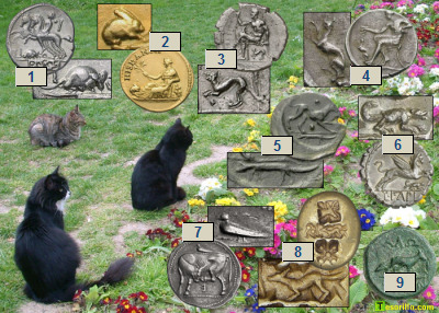 Aparecen tal variedad de animales en las monedas de la Edad Antigua, que he necesitado hacer 12 partes: I - XII (juegos nº 5 a 16). Por ahora he encontrado 126 animales distintos. Seguramente habrá más, por lo que cualquier idea siempre será bienvenida (e-mail). Para buscar algún animal concreto lo recomendado es ir a los índices alfabéticos: A - G y H - Z, en los que además se indica la procedencia y el link correspondiente de cada moneda.