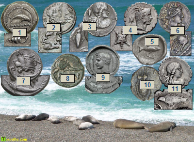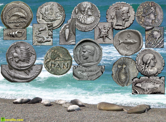 Sobre la imagen de una playa de la península Valdés (Argentina), en la que descansaban algunos lobos y elefantes marinos, he colocado once monedas antiguas que muestran diversos animales del hábitat fluvial o marino, (a excepción del león, claro). En los denarios republicanos romanos vemos con frecuencia pequeños animales que en realidad son marcas de control, símbolos utilizados para distinguir las diversas series entre sí. (Y gracias a ello esta relación de animales es tan extensa). Los cuatro denarios republicanos mostrados presentan unas incisiones en los bordes, por eso les llamamos denarios "serratos" (dentados). ¿Sabrías decirme por qué hacían estas muescas en las monedas?
