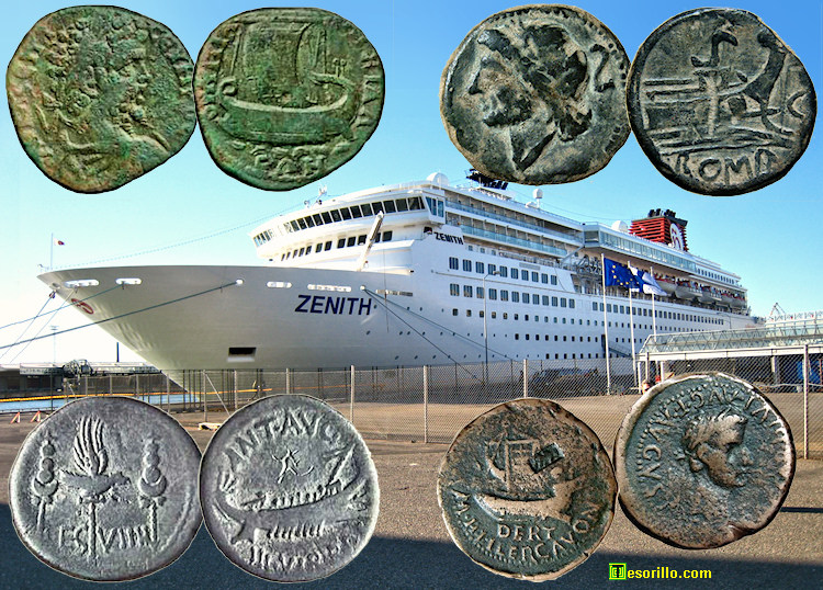 colocado cuatro monedas del Mundo Antiguo con representaciones de embarcaciones de la época.