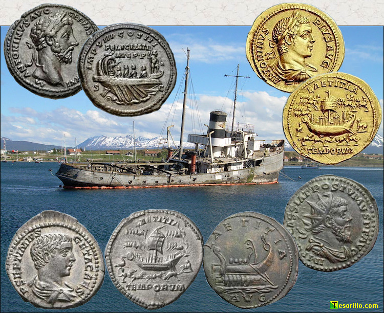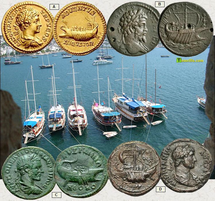 he colocado otras cuatro monedas antiguas que presentan embarcaciones de la época. Estas cuatro monedas tienen una