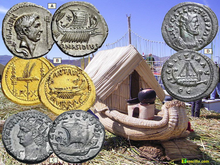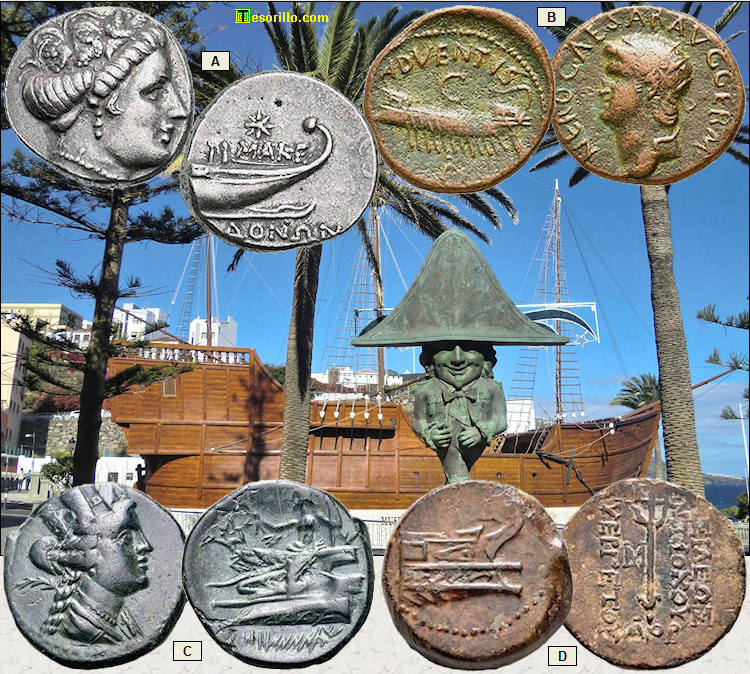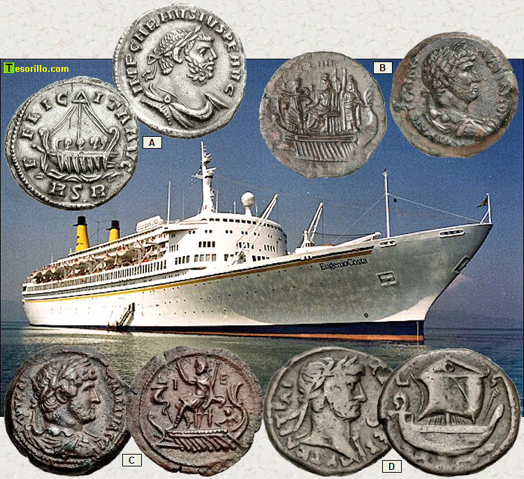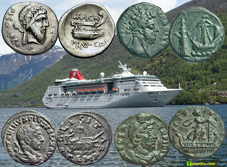 he colocado cuatro monedas antiguas con representaciones de embarcaciones de la época.