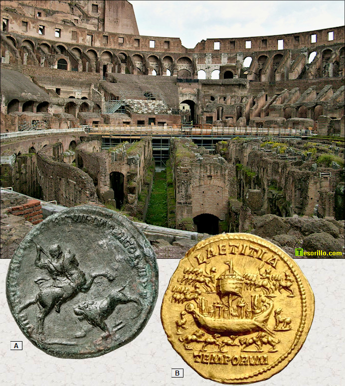 B.- Representación de carrera, naumaquia y venación: Áureo de Septimio Severo (Roma,