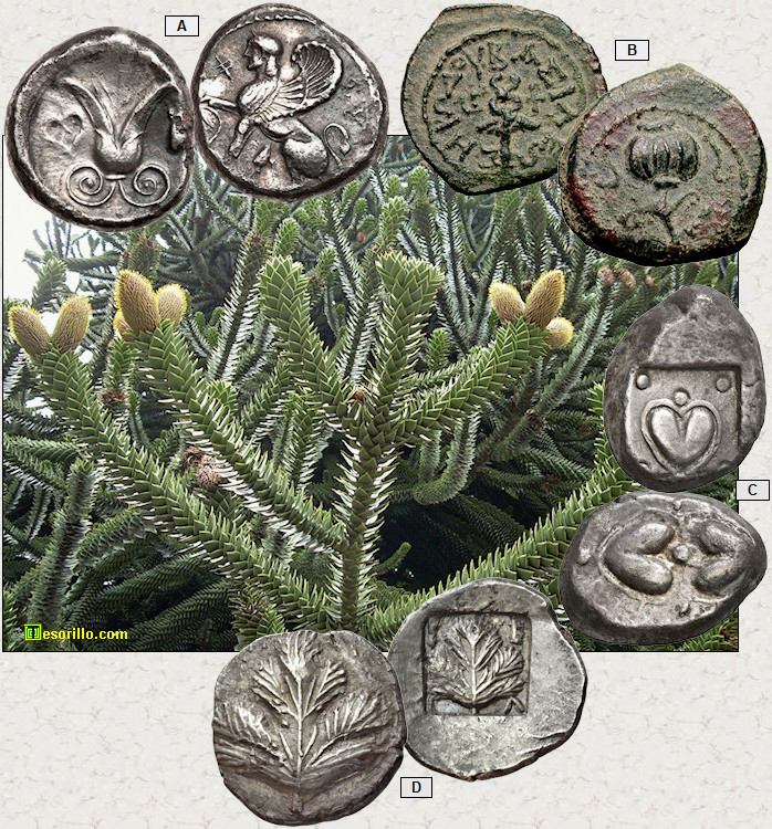 Los ejemplos de árboles, plantas, ramas, hojas, flores y frutos en la numismática