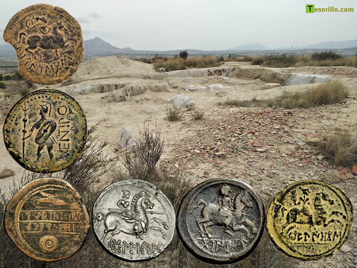 ibérico de Castillejo de los Baños (Fortuna, Murcia), he distribuido seis monedas acuñadas en Hispania