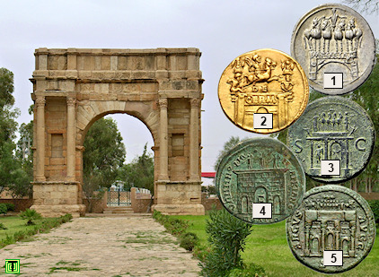 En la primera parte de este juego de los arcos romanos vimos exactamente ocho fotografías y doce monedas, pero el asunto bien merece que veamos alguna más. En esta segunda parte muestro otras pocas imágenes y sus correspondiente monedas. Sobre una fotografía del arco triunfal de Diocleciano de la antigua Sufetula (hoy Sbeitla, Túnez), erigido para conmemorar la nueva forma de gobierno (La Tetrarquía), he colocado los reversos de cinco monedas que representan diversos arcos de triunfo romanos. Dos de ellas fueron acuñadas en Roma, otras dos en Lugdunum y la última en Markianopolis. Reconozco que no es sencillo, pero... ¡intenta identificarlas!