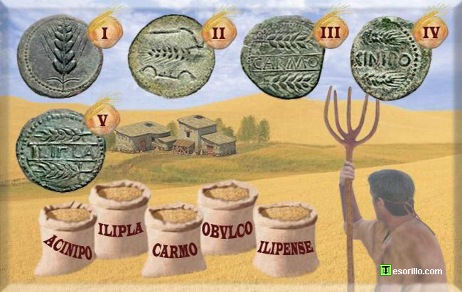 La romanización supuso para las provincias hispanas una especialización de sus cultivos, que pasaron a formar parte de la "despensa" del Imperio romano. Este cambio en la economía se vio reflejado en los motivos acuñados en las cecas provinciales latinas. A continuación encontrarás cinco reversos con representaciones de cereales. Aunque parecidos, todos pertenecen a distintos lugares. Identifica las cecas en donde fueron acuñadas estas cinco monedas hispanas.
