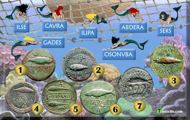Un pescador ibero aguardaba en su barca el momento oportuno para recoger sus redes. El mar estaba en calma y todo hacía presagiar una buena pesca. Pero entre tanto, bajo la superficie, un grupo de sirenas liberaba a los peces que habían quedado atrapados. Entre las capturas había ejemplares procedentes de varias cecas de Hispania. Identifica las cecas en donde fueron acuñadas estas siete monedas.