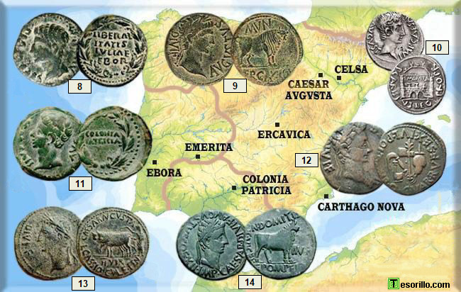 En este mapa vemos la nueva partición de Hispania que llevó a cabo el emperador Octavio Augusto; las antiguas Provincias Citerior y Ulterior pasaron a ser tres: Tarraconensis, Baetica y Lusitania. En la imagen puedes encontrar siete de las ciudades que acuñaron moneda con la efigie del emperador. Identifica las cecas a las que pertenecen estas monedas. Demasiado sencillo, ¿no? Indica entonces la denominación de las monedas y especifica si son provinciales o imperiales.