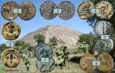 he colocado seis objetos de plomo que tienen forma de moneda y fueron realizados por diversas culturas antiguas.