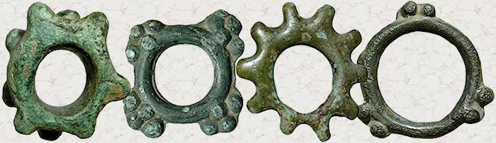 Todos estos interesantes artefactos fueron fundidos (no acuñados), excepto uno que no es de metal. ¿Sabes a cuál me refiero?
