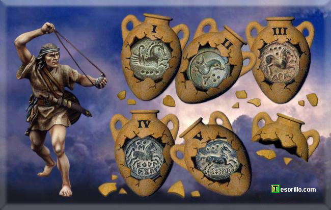 En el interior de estas ánforas hay ocultos varios cuartos / cuadrantes hispánicos, pero entre ellos también se encuentra algún otro tipo de pequeños divisores. Todos estos bronces presentan unos puntos o glóbulos que son marcas de valor, signos que nos indican su nombre, pero... ¡no es tan fácil! Ayuda al hondero balear a diferenciar los tipos de monedas que contienen las ánforas.