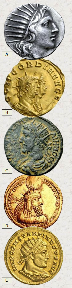 A principios del siglo III d.C. aparece el antoniniano y con él de nuevo las coronas radiadas.