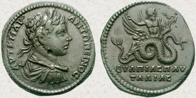 Si los griegos fueron amantes de sus mitos, los romanos pronto los hicieron propios, y por ello, a todo lo largo y ancho del mar Mediterráneo encontramos ejemplos de monedas con animales mitológicos. Otras culturas de la Edad Antigua, tales como la fenicia, persa o celta, tampoco fueron ajenas a este tipo de representaciones. Pero sería durante los siglos II y III d.C. en las series denominamos grecorromanas (en realidad, monedas provinciales romanas, acuñadas en la zona oriental del Mediterráneo), cuando se representaran impresionantes monedas de bronce con completas escenas mitológicas de indudable belleza, tales como la mostrada a continuación.