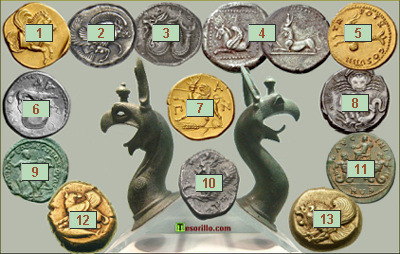 Sobre la fotografía de unos grifos que se encuentran en el Museo Arqueológico de Atenas (Grecia), he colocado trece impresionantes monedas antiguas con representaciones de animales mitológicos. En ellas podemos ver estos míticos animales: caballo alado, jabalí alado, perro alado, lince alado, león alado, dragón marino, hipocampo, esfinge, grifo, capricornio, can Cerbero, Minotauro, titanes y el mítico monstruo marino denominado Escila. La mayoría son monedas griegas, algunas hay romanas y otras... Bueno, esa es la pregunta, ¿Qué monedas de las que aquí aparecen no son griegas, ni romanas? ¿A qué culturas pertenecen?