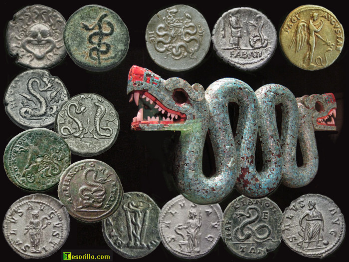 Sobre la fotografía de una impresionante serpiente azteca con dos cabezas que se encuentra en el British Museum (Londres), he colocado catorce monedas antiguas con diversas representaciones de serpientes. En ellas podemos ver monedas griegas y romanas que cubren el largo periodo que hay entre los siglos V a.C. y III d.C. ¿Sabrías indicar cuales son las cuatro monedas que fueron acuñadas en Roma? Demasiado fácil, ¿no? Dime entonces cuál es la moneda más antigua y también la más moderna.