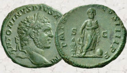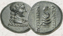 Asclepio (Esculapio para los romanos) era el dios de la medicina y la curación en la mitología griega, siendo venerado en gran número de santuarios a los que acudían multitudes que pasaban la noche en habitaciones especiales para dormir; allí esperaban que el dios los curara directamente por medio de una aparición en sueños, o que durante sus sueños les indicara alguna cura o algún signo que el sacerdote del templo pudiera interpretar. Los miembros de la familia de Asclepio también ejercían funciones médicas. Su mujer Epione, calmaba el dolor. Sus hijas: Higía / Higea (Salus para los romanos), diosa de la prevención (la salud, la higiene); Panacea, que ayudaba en el tratamiento (en la curación universal gracias a las plantas); Yaso, que facilitaba la curación (recuperación); Aceso se relaciona con la sanación e Egle simboliza el brillo sanador (la belleza del cuerpo humano cuando tiene buena salud). Sus hijos eran tres: Telesforo, que representa la convalecencia (la recuperación de la enfermedad), y Macaón y Podalirio, que son divinidades protectoras de cirujanos y médicos, respectivamente. La antigua serpiente que figura en el bastón de Asclepio ha llegado hasta nuestros días como símbolo de la Medicina y la copa de su hija Higía (el recipiente con el que suele dar de comer a una serpiente) es hoy el distintivo de la ciencia farmacéutica. En algunas ocasiones podemos encontrar el caduceo alado de Hermes relacionándolo con la medicina o la farmacia, pero es un error, este símbolo es más propio del comercio o la economía. Asclepio (Esculapio), Higía (Salus) y Telesforo, son las tres divinidades relacionadas con la medicina que aparecen en las monedas antiguas (griegas y romanas). Veamos ahora seis elegidos ejemplos de estas interesantes representaciones.