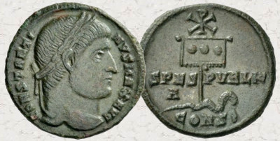 El claro simbolismo mostrado en el reverso de estas monedas de Constantino Magno y Valentiniano III, nos presenta a la serpiente como un animal maléfico al que hay que destruir. En el siglo IV d.C., con la oficialización en Roma del cristianismo, la serpiente es asociada al mal e identificada con el demonio, siendo esa la interpretación que prevalece hoy en día en Occidente. (No en Oriente).
