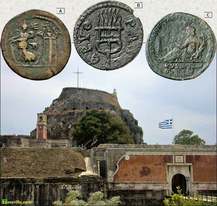 A las cuatro monedas romanas mostradas deberíamos añadir alguna acuñación griega. Sin ánimo de ser exhaustivo (la muestra podría ser bastante más amplia), veamos ahora otras pocas monedas que nos muestran faros y/o puertos de la Antigüedad sobre las imágenes de faros y/o puertos actuales.