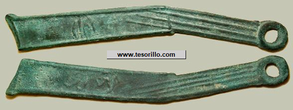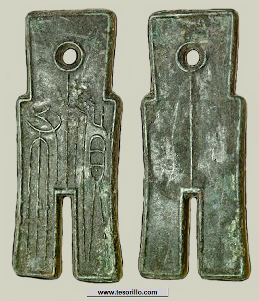 Moneda de bronce fundida en forma de cuchillo, de 130-137 mm de larga,12-16 de ancha y 13,4 g, utilizada