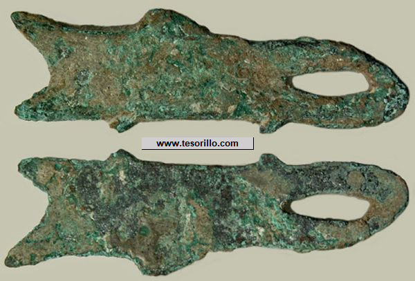 Bronce (54 mm y 6,1 g) en forma de pez, con un agujero que facilita