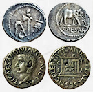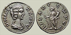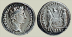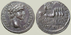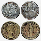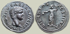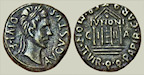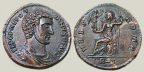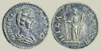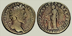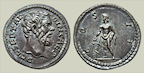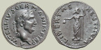 Roma sedente, a la izquierda, portando Victoria en su mano derecha y cetro en la izquierda.
